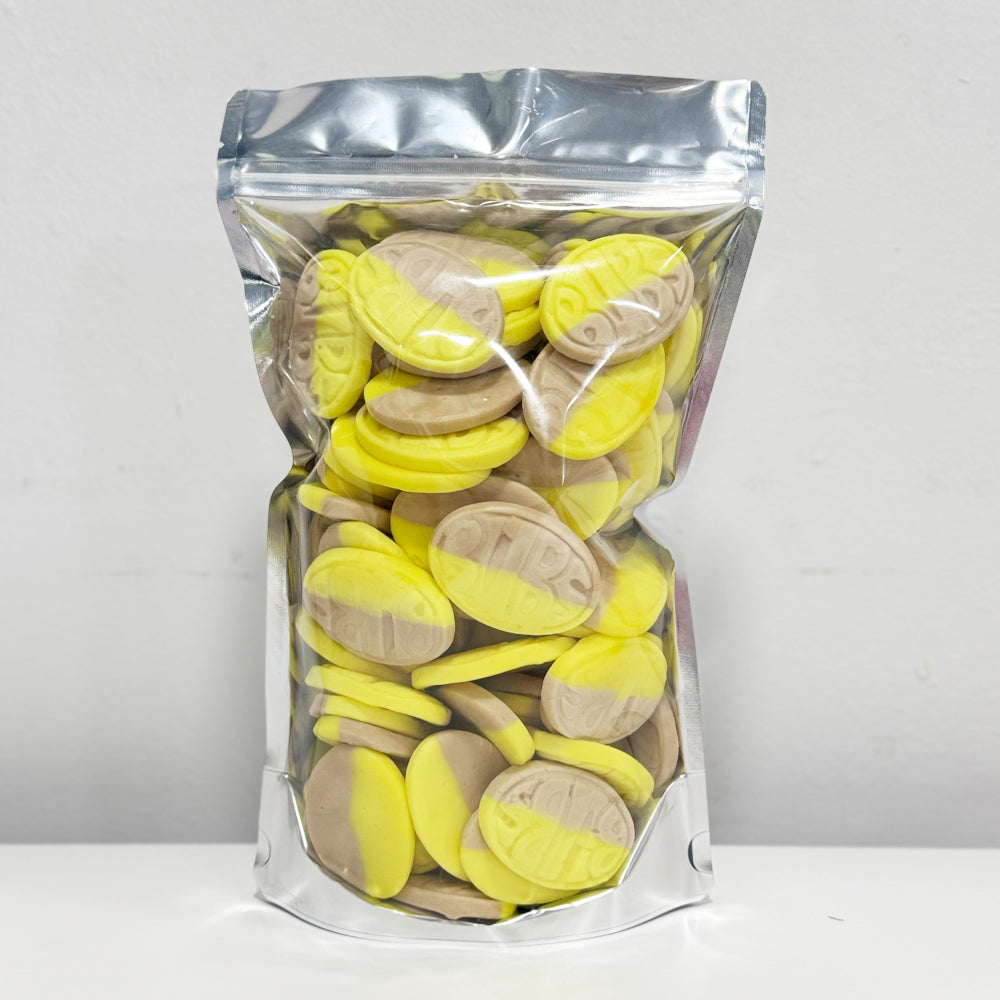 Ingredients : Glucose-fructose syrup, sugar, cornstarch, water, acidity regulators (malic acid, sodium citrate), potato protein, flavours, colours (E150d, E100), coconut oil, galzing agent (carnauba wax)
