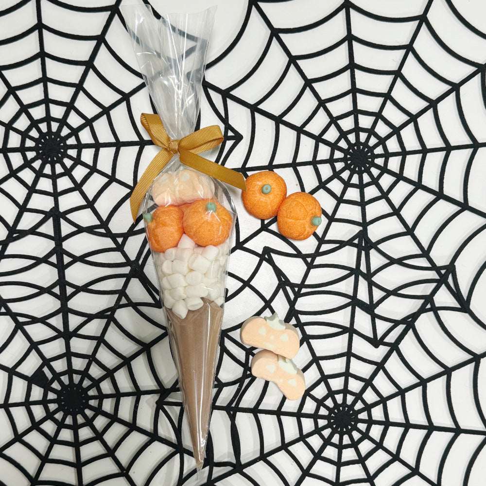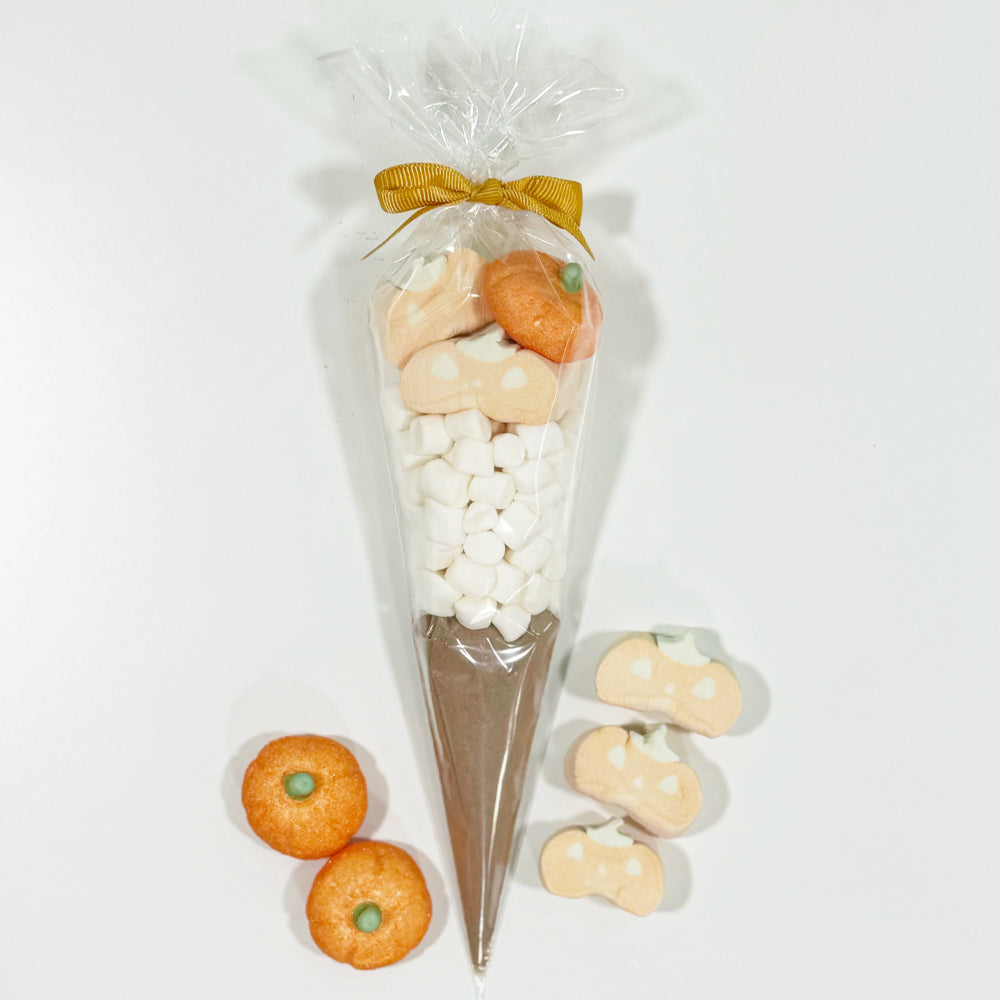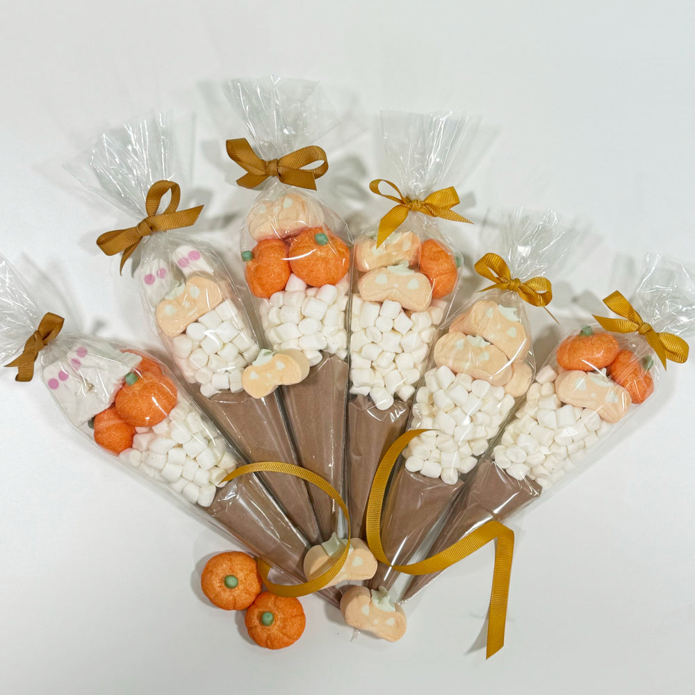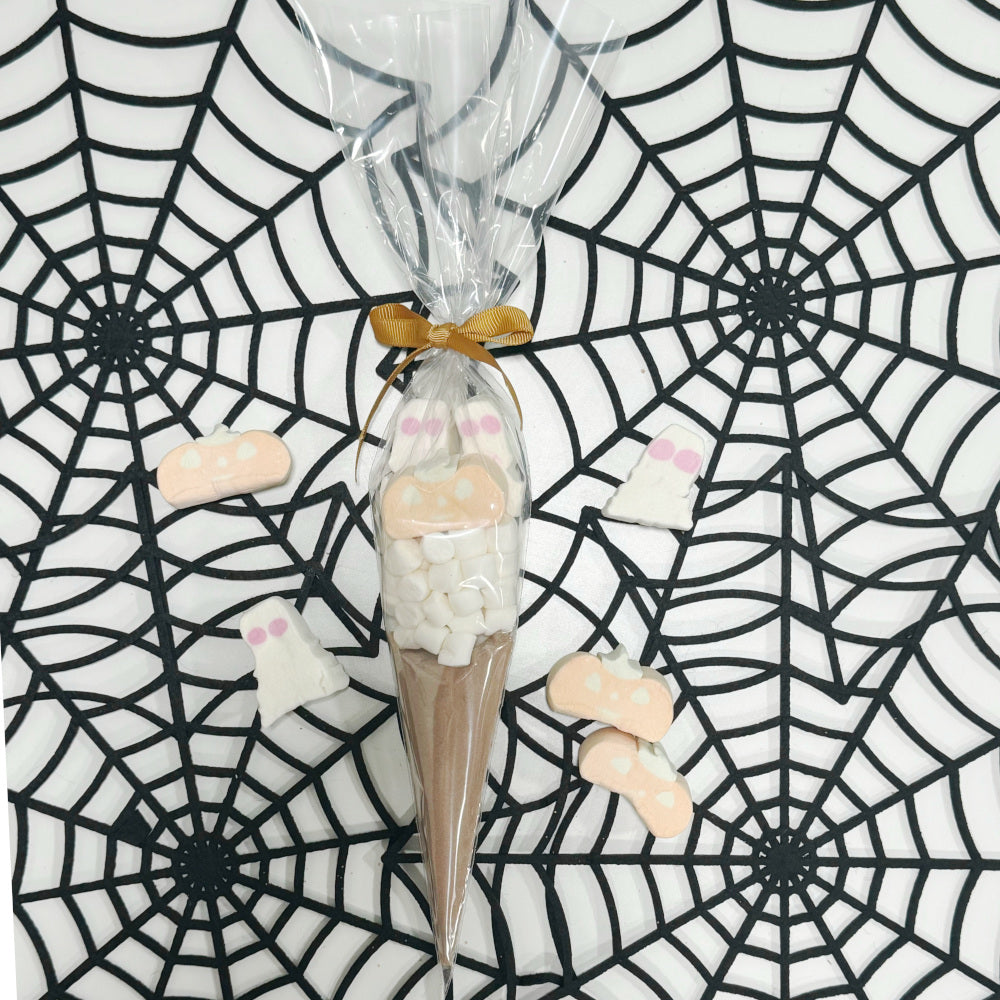 Indulge in our Halloween Hot Chocolate Cones! Each cone features rich Cadbury hot chocolate paired with fluffy mini white marshmallows, playful pumpkin marshmallows, and spooky ghost marshmallows. Perfect for cozy nights, these treats are beautifully tied with a colourful ribbon, making them a delightful gift or festive addition to your celebrations!