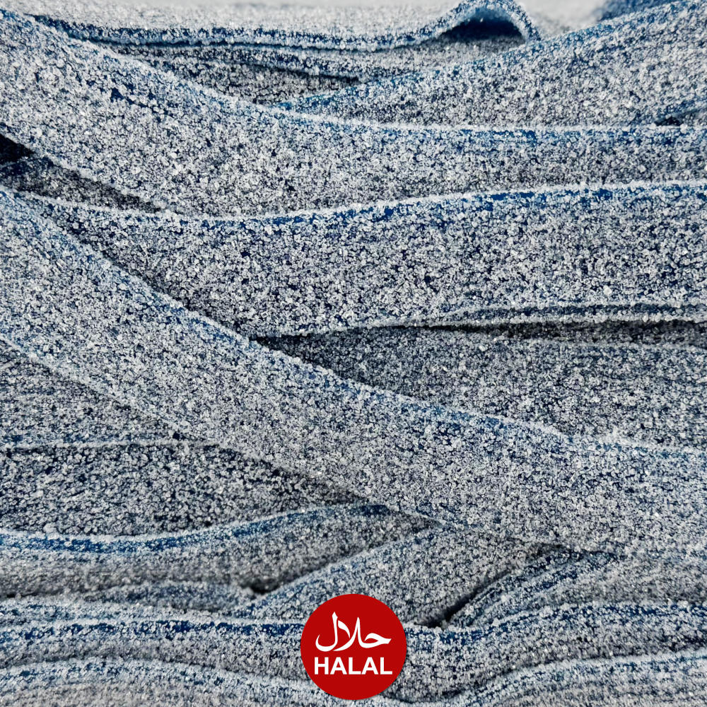 Blue raspberry flavoured liquorice belts. Coated in sugar for extra sweetness.